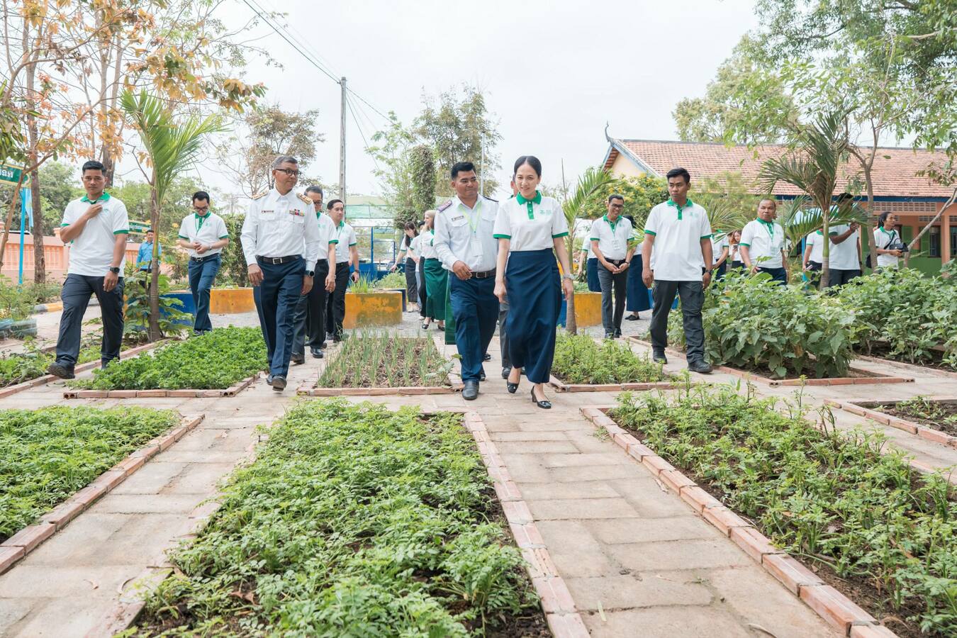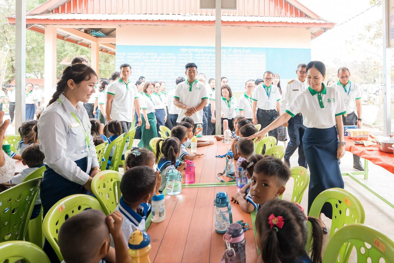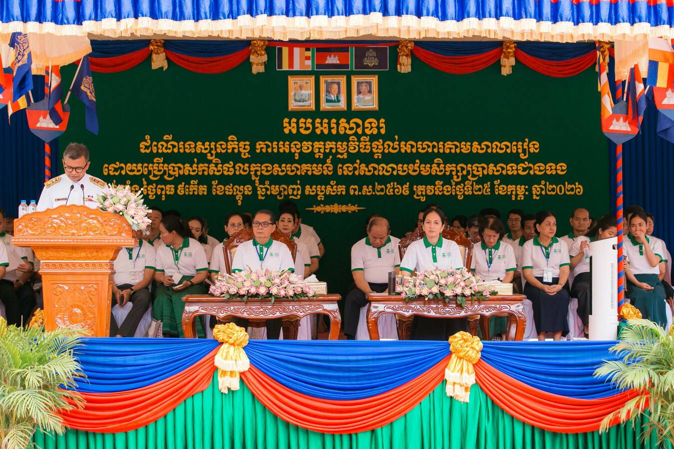លោកជំទាវបណ្ឌិត ពេជ ចន្ទមុន្នី ហ៊ុនម៉ាណែត ស្ត្រីទី១ នៃកម្ពុជា និងសម្តេចមហាមន្ត្រី គុយ សុផល ឧបនាយករដ្ឋមន្ត្រី រដ្ឋមន្ត្រីក្រសួងព្រះបរមរាជវាំង អញ្ជើញជាអធិបតីពិធីអបអរសាទរដំណើរទស្សនកិច្ចការអនុវត្តកម្មវិធីផ្តល់អាហារតាមសាលារៀន ដោយប្រើប្រាស់កសិផលក្នុងសហគមន៍ នៅសាលាបឋមសិក្សាប្រាសាទជាងទង ស្ថិតក្នុងភូមិក្រាំងប្រស្វាយ ឃុំស្វាយជ្រុំ ស្រុករលាប្អៀរ ខេត្តកំពង់ឆ្នាំង ដោយមានការអញ្ជើញចូលរួមពីសំណាក់ ឯកឧត្តមបណ្ឌិតសភាចារ្យ ហង់ជួន ណារ៉ុន ឧបនាយករដ្ឋមន្ត្រី រដ្ឋមន្ត្រីក្រសួងអប់រំ យុវជន និងកីឡា អាជ្ញាធរដែនដី លោកគ្រូអ្នកគ្រូ និងសិស្សានុសិស្ស ជាច្រើនរូប។